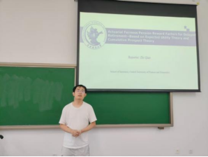 9月9日,乔智同学在“Pension System III”分会场上宣讲了与杨再贵教授合作的论文Synergistic Reform of Pension Contribution Rates and Delayed Retirement。他将基本养老保险精算模型与跨期决策的世代交叠模型相结合,基于减轻养老保险财政负担和提升个人效用双重目标测算了延迟退休与养老保险降费的协同改革空间。他发现,协同改革存在有效区间,企业缴费率和延退年限都有上下限。本次延迟退休改革后,男职工退休年龄已接近延退年龄下限,进一步提高退休年龄需配合降费措施,而女职工仍有延退空间。