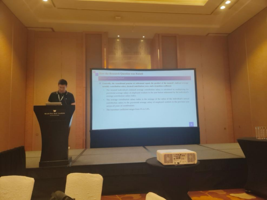 9月8日,焦浩轩博士在“Pension System Ⅰ”分会场上宣讲了与杨再贵教授合作的论文Reform of Basic Pension Insurance Benefit Calculation Evidence from China。他基于国务院关于企业职工基本养老保险的相关文件,构建过渡性养老金精算模型,创立“中人”视同缴费年限对应的个人账户养老金精算模型,研究企业职工基本养老保险过渡性养老金现行计发办法偏离初衷导致的支付缺口和财政负担。他发现,现行过渡性养老金支出显著高于视同缴费年限对应的个人账户养老金支出成为财政负担逐年加重的重要原因之一。他表示,将视同缴费年限对应的个人账户养老金作为过渡性养老金,并将现行过渡性养老金超发额转入第二、三支柱养老保险,不仅可以显著降低财政负担,还有助于破解基本养老保险“一支独大”的难题,壮大第二、三支柱养老保险的发展,完善多支柱养老保险体系。