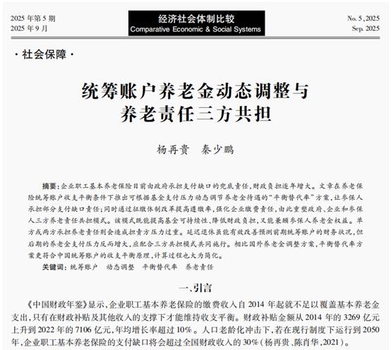 近日,我们杨再贵教授和秦少鹏博士的合作论文《统筹账户养老金动态调整与养老责任三方共担》发表在重要期刊《经济社会体制比较》上。
