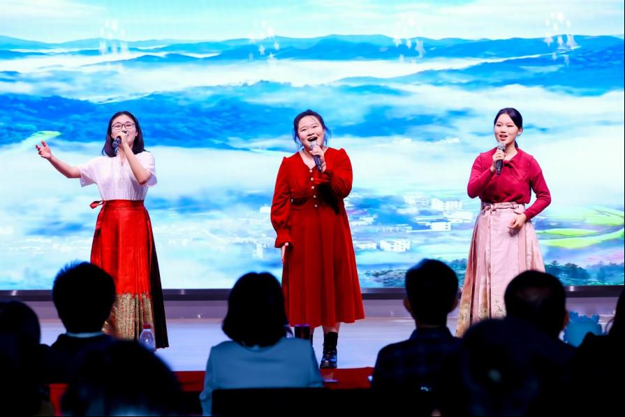 甘馨寧(保险23)、李雨馨(精算24-2)、张羽鹤(精算25-3)联袂献上歌曲串烧《飞云之下》《南山南》。歌声时而空灵辽阔,宛如穿越云海;时而深沉婉转,恰似低回浅唱。三段各具特色的嗓音完美衔接,带领观众完成了一次从苍穹到故土的心灵漫游,余韵悠长。在《南山南》的最后,三位歌手还献上了改编版的《南山南》,“龙马志,担乾坤,红色财经魂”的歌声久久回荡在金厅的上空,引起现场师生的共鸣。