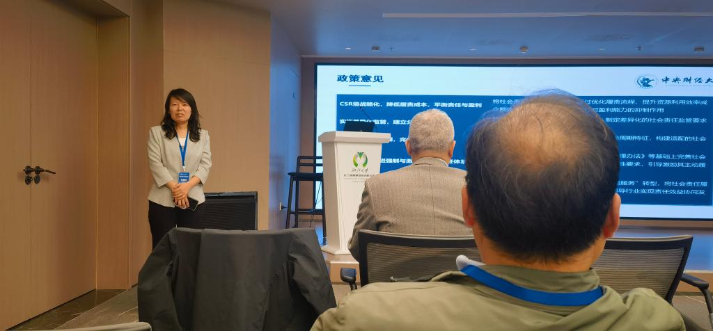 在论坛报告环节,王丽珍教授以“社会责任与经营目标:此消彼长还是协同促进?——基于我国保险业的实证研究”为题发表学术报告,该研究探究社会责任与经营目标的互动效应与公司规模层面的门槛效应。研究表明保险公司保费规模与社会责任协同促进,而盈利能力与社会责任关系具有 “双重性”,且具有显著门槛效应。该项研究聚焦作为社会“稳定器”与经济“减震器”功能的保险业,为保险公司优化履责、协调经营目标提供借鉴参考,也为保险行业实现高质量发展提供理论依据。