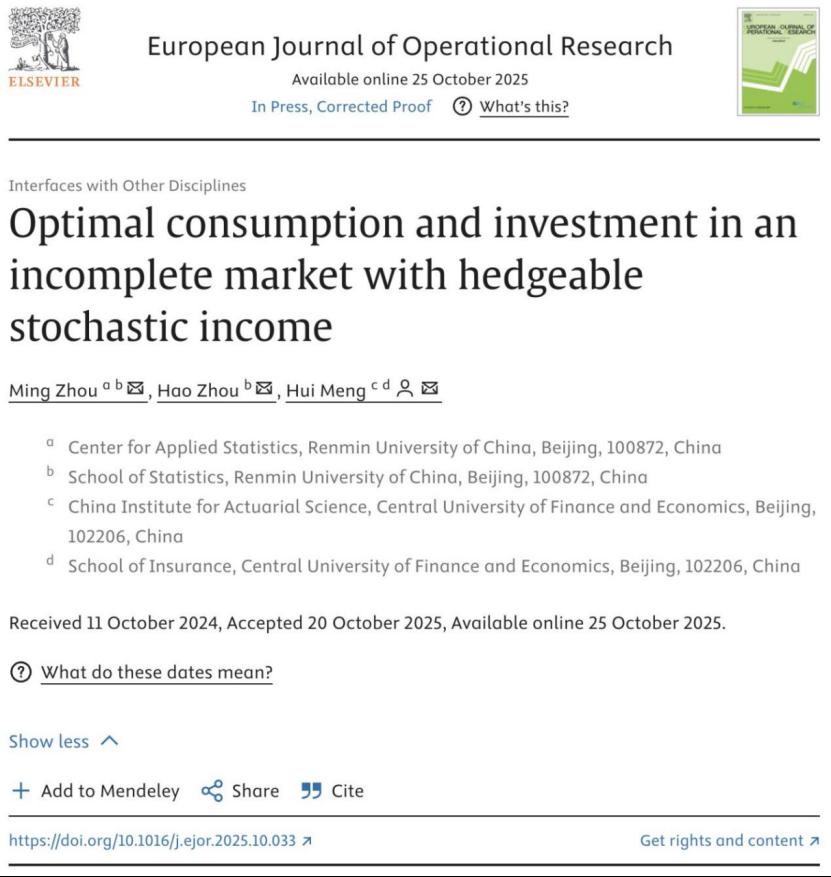 我们孟辉教授近日与中国人民大学周明教授及博士生周豪在我们AAA类期刊European Journal of Operational Research在线发表论文,题目为“Optimal consumption andinvestment in anincompletemarket withhedgeablestochastic income”,其网址为https://www.sciencedirect.com/science/ article/abs/pii/S0377221725008537。